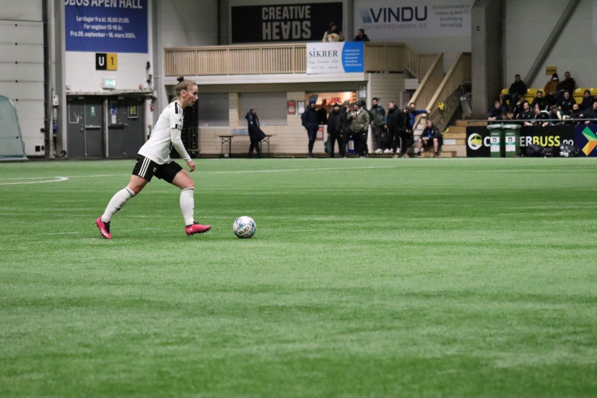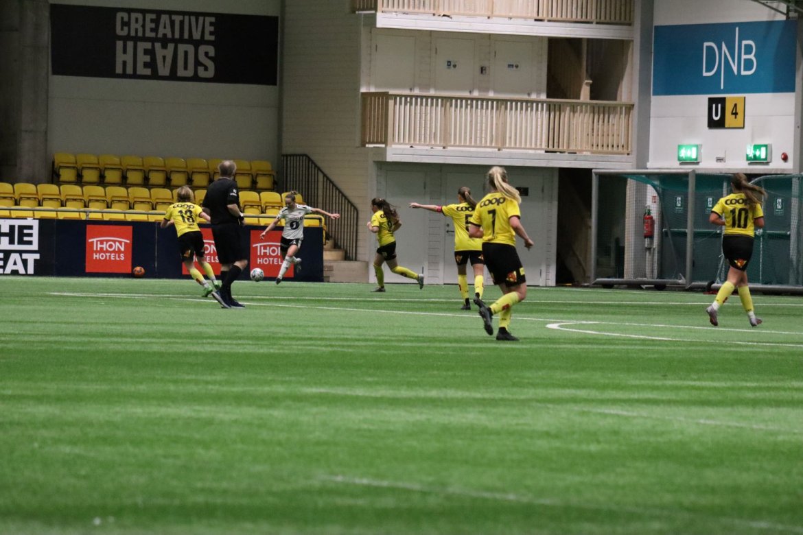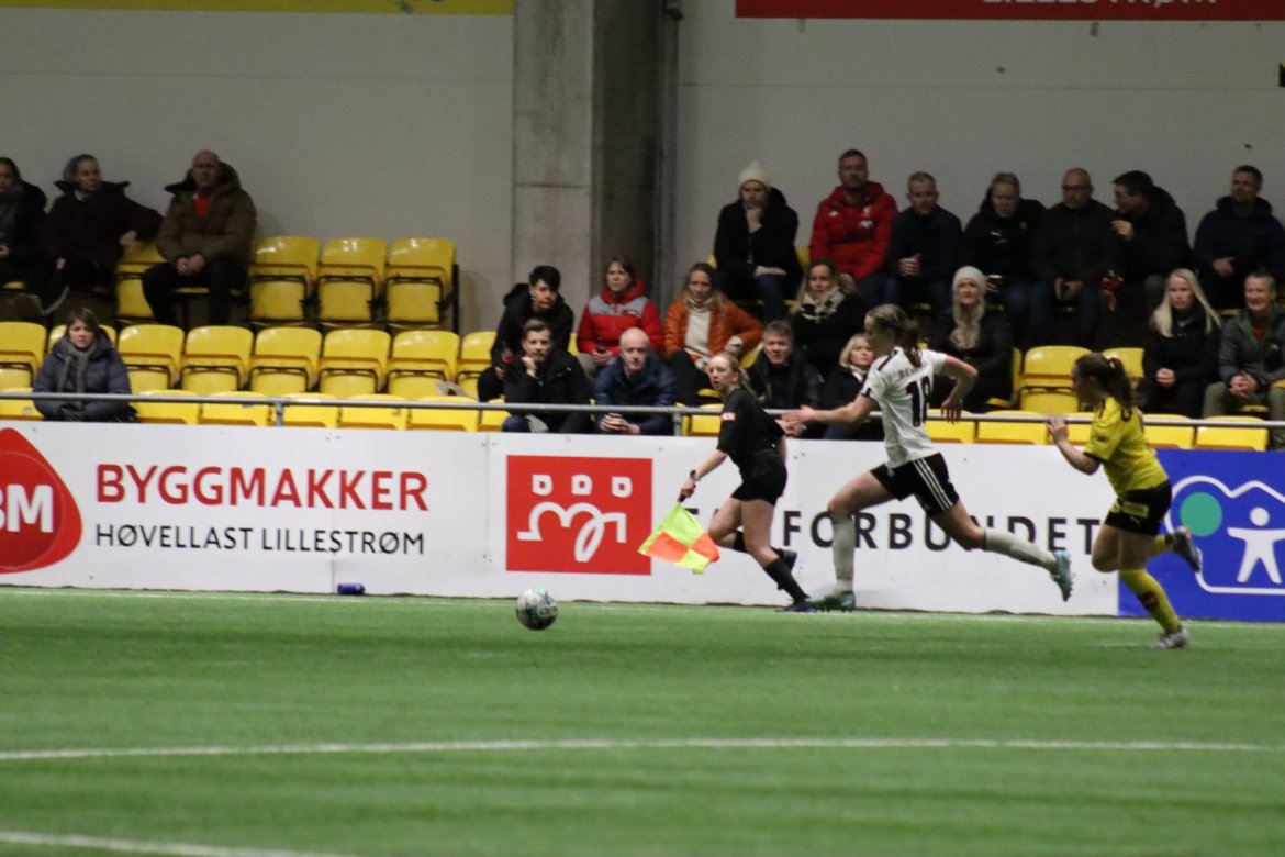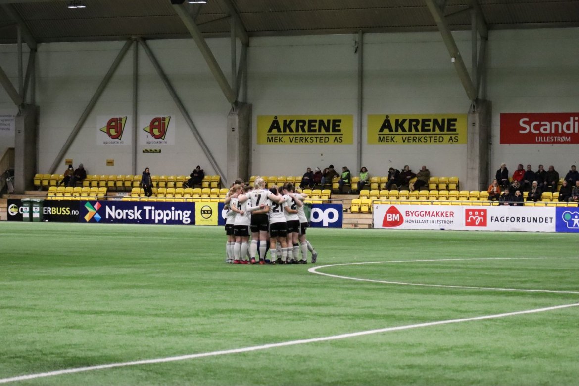 Med kampstart kl. 19.30 er det duket for å brette opp ermene, gjøre et solid stykke arbeid og virkelig blø for drakta. Kampen starter nok en gang med et godt forsvar, og allerede etter 9 minutter lykkes vi i den defensive jobben der vi sideforskyver godt og flytter beina kjapt. Linnea Rustad ser sitt snitt til å snappe ballen fra Lillestrøms forsvarsspiller som fører framover, før hun setter fart nedover høyrekanten. Med høyt tempo gjør hun ingen feil og setter ballen hardt og trygt i mål! Vi åpner med en pangstart, noe som skaper selvtillit og energi i laget. Lillestrøm virker noe rystet, og kampen bølger frem og tilbake hvor begge lag angriper og har målfarlige sjanser. Vi går til pause med 0-1 og føler oss noe tryggere enn sist kamp.