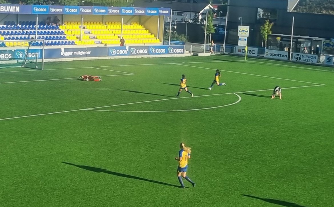 Det tar ikke mer enn tre minutter inn i første omgang før det glipper for damene og det blir en liten kalddusj i det ellers varme været. Med sterk sol i fleisen slipper vi inn på et halvdårlig innlegg og en svak heading. En vanligvis linjesterk Christina når ikke bort til headingen som spretter inn i hjørnet, og laget får en liten støkk som varer i ca. ti minutter. Deretter skaper vi mer enn nok sjanser til å utlikne ved å være alene med keeper opptil flere ganger, men det vil seg ikke denne dagen. Treneren blir stående og klø seg litt i hodet, hva er det som skjer? Er det et påbegynnende solstikk som har truffet troppen? Det er vanskelig å vite, men vi går til pause med et bra trykk som vi ønsker å opprettholde, og en følelse av at det kan skje noe i den neste omgangen.