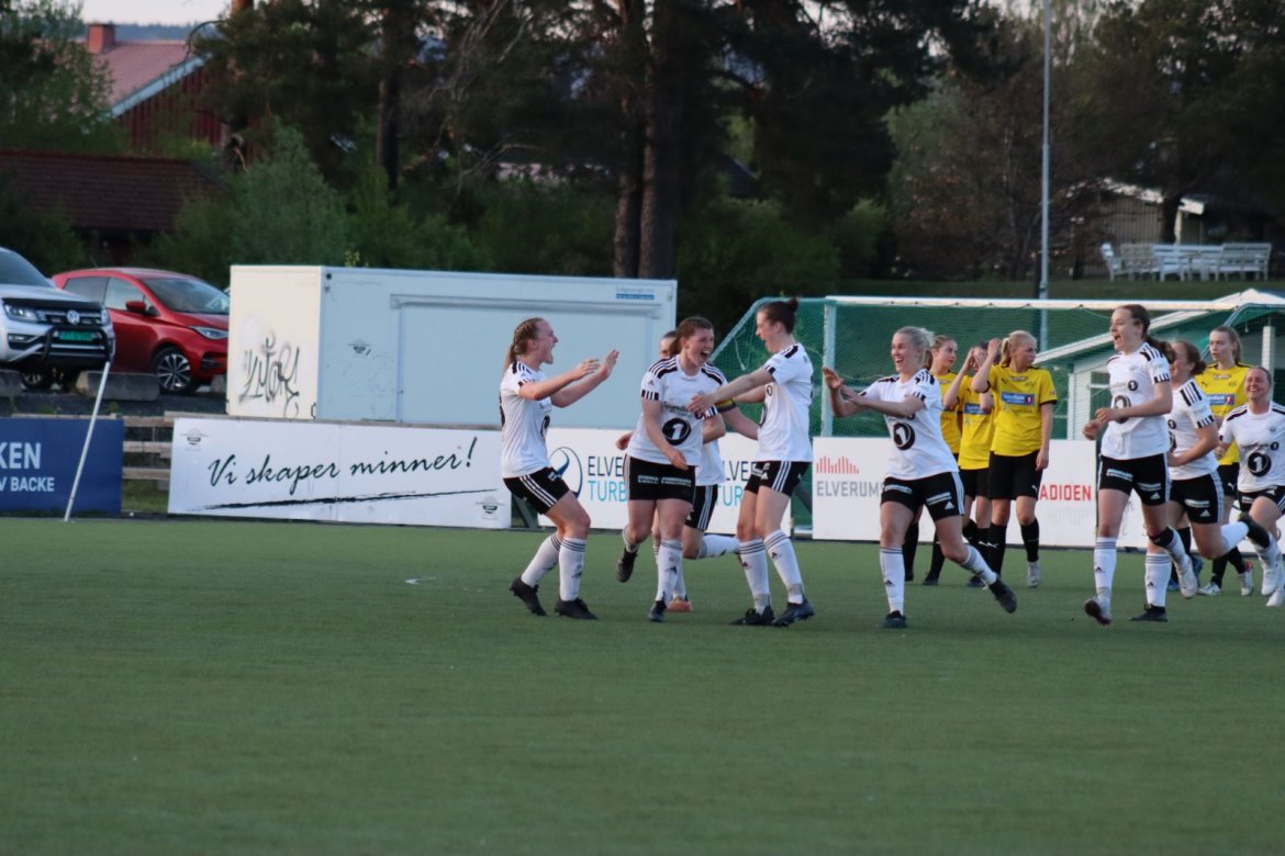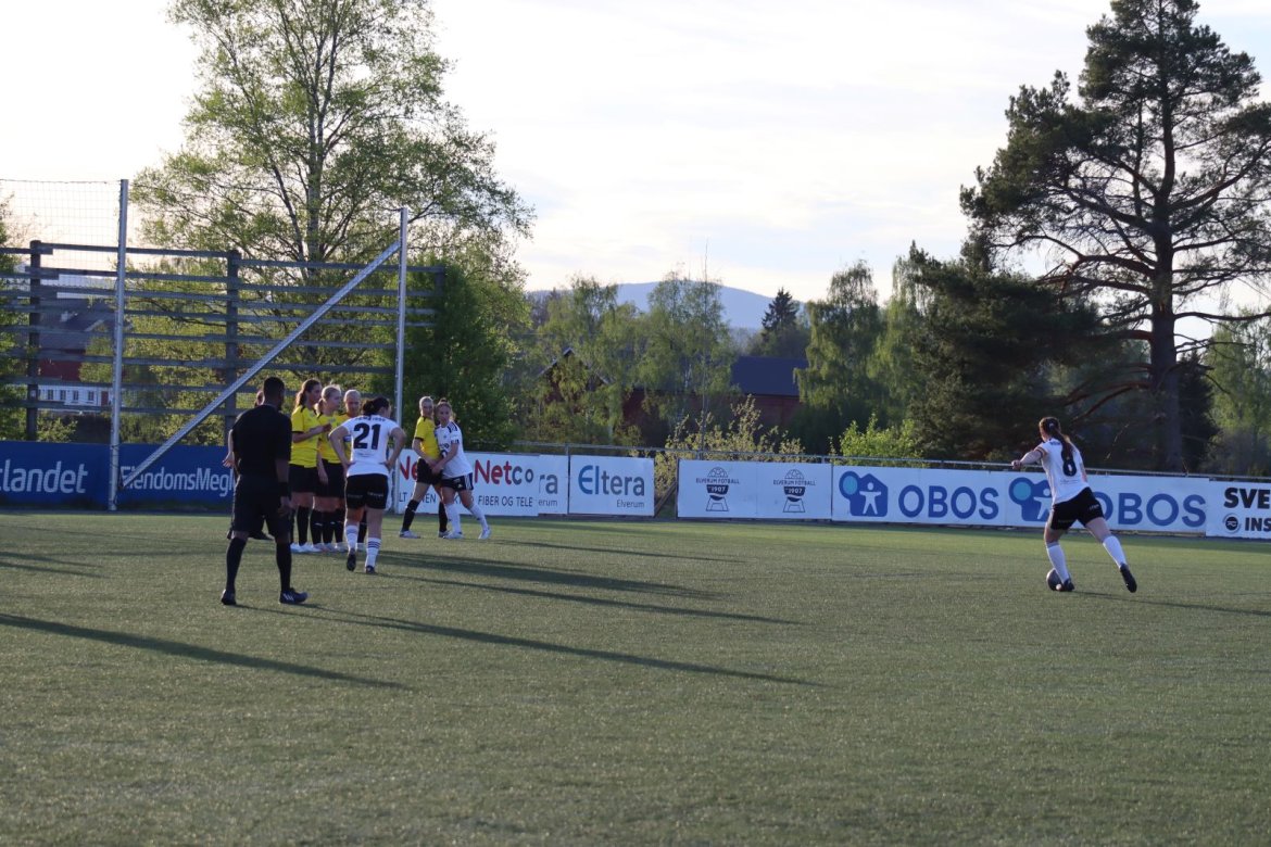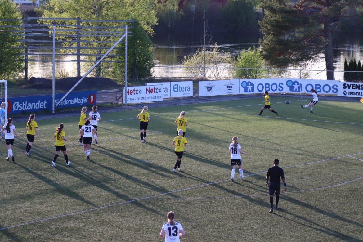 Men så får vi et frispark utenfor 16-meteren til Ottestad helt på tampen av kampen. Vi har allerede scoret ett vakkert mål på dødball, og dette skal igjen være oppskriften på mål i Elverum. Både tribune og innbytterbenk settes i fyr og flamme da Nora Eriksson nok en gang er framme med silkefoten. Med nerver av stål settes ballen i en lekker bue over både mur og keeper, og Elverum går opp i 2-1 to minutter på overtid. Det ser ut til at vi drar i land seieren, men i jubelrusen rekker vi ikke en gang å lande før motstanderen utnytter seg totalt av alt adrenalinet i Elverum. Etter et langt avspark er spissen plutselig alene med vår keeper Christina, og utlikner dessverre bare SEKUNDER senere. Aldri har vi på hjemmebenken opplevd en kaldere dusj, og gledestårene ble omgjort til sorg da dommeren blåser av kampen rett etter vårt avspark. Sluttresultatet ble derfor 2-2 og enda et uavgjort lokaloppgjør.
