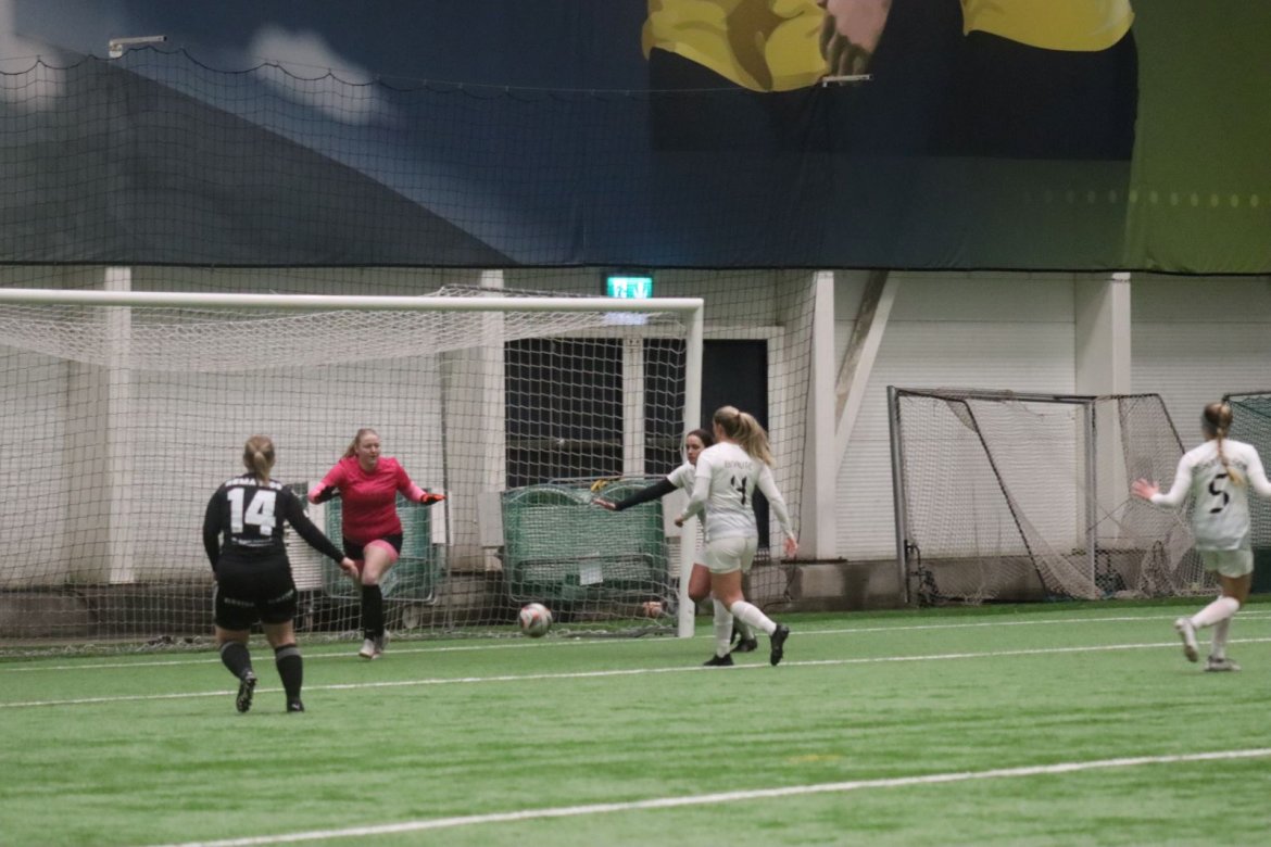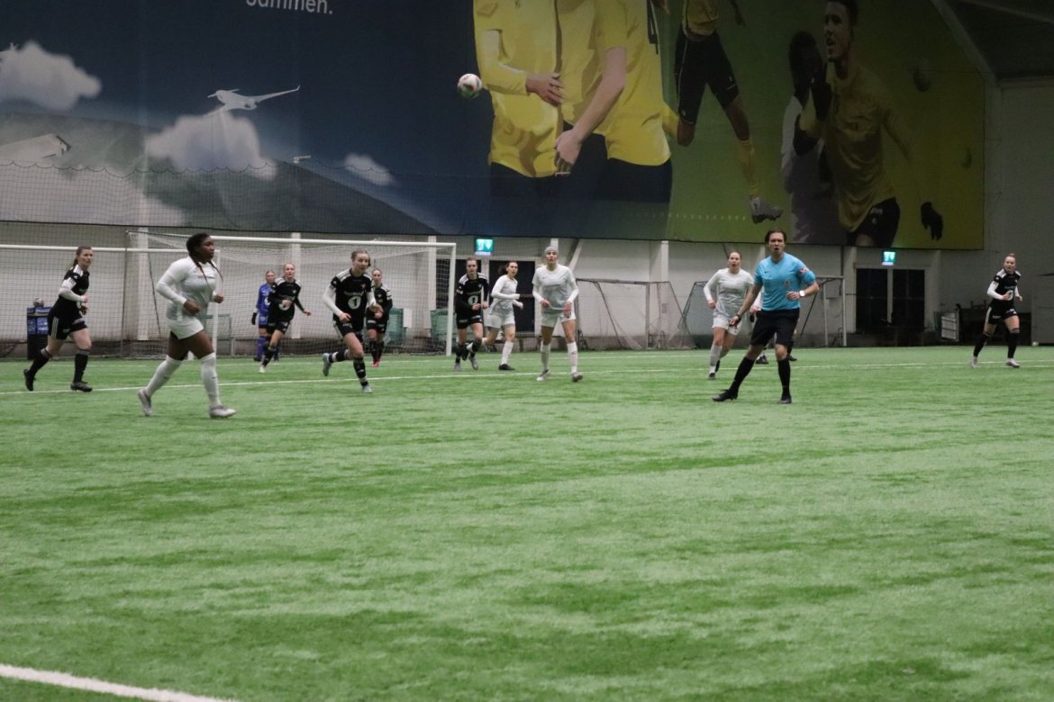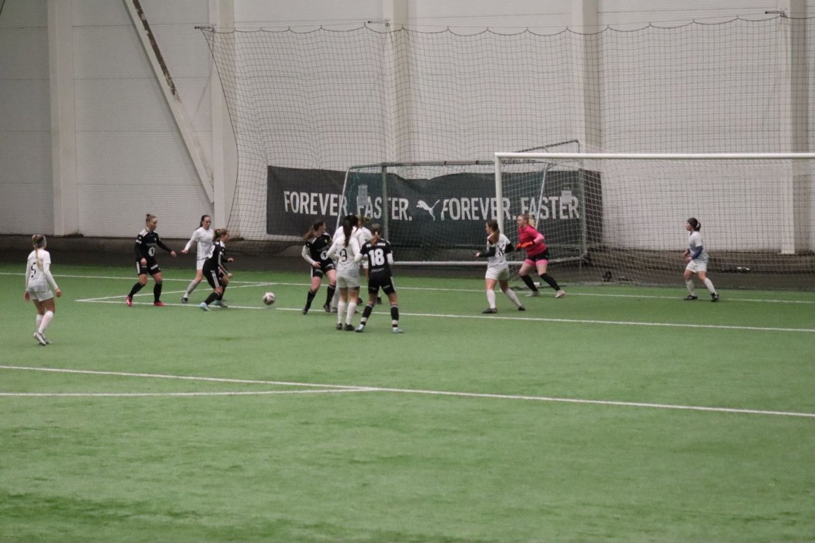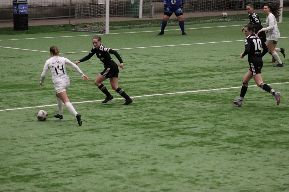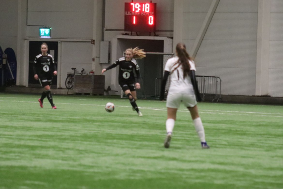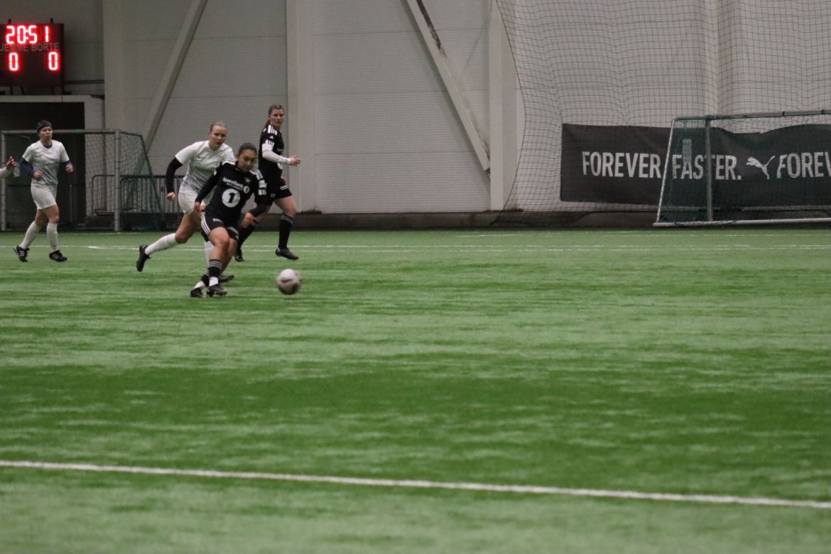 Med alle forutsetninger på plass starter det litt typisk for et lag blandet av ungdommelig pågangsmot og rutinerte gode fotballspillere, nemlig rufsete og hawaiifotball. De første 10 minuttene preges av alle inntrykk vi må ta innover oss, og at det vi har ventet så lenge på endelig er i gang. Det kommer et par skudd imot som havner i stolpen, og målet er heldigvis en god venn denne gangen. Etter hvert kommer vi oss mer inn i kampen og kan takke oss selv for at vi har hatt fokus på forsvarsspill, for det redder oss. Det offensive tar mer tid å få på plass, men vi plukker opp et rom som FC Oslo etterlater seg og klarer på et tidspunkt å utnytte dette. Nora Eriksson vender nydelig opp lavt i banen, og Linnea Rustad er på hugget og starter tidlig på en lang tversover som går over backen til FC Oslo. For første gang i kampen er vi igjennom, Linnea lader kanonen og sender oss opp i 1-0 ledelse med et godt plassert skudd som går over keeper og inn i motsatt hjørne. Vi har tatt ledelsen mot spillets gang, noe som gir laget en enorm selvtillitsboost! Vi er på høyde med FC Oslo ut resten av 1. omgang, og styrer mer av spillet.