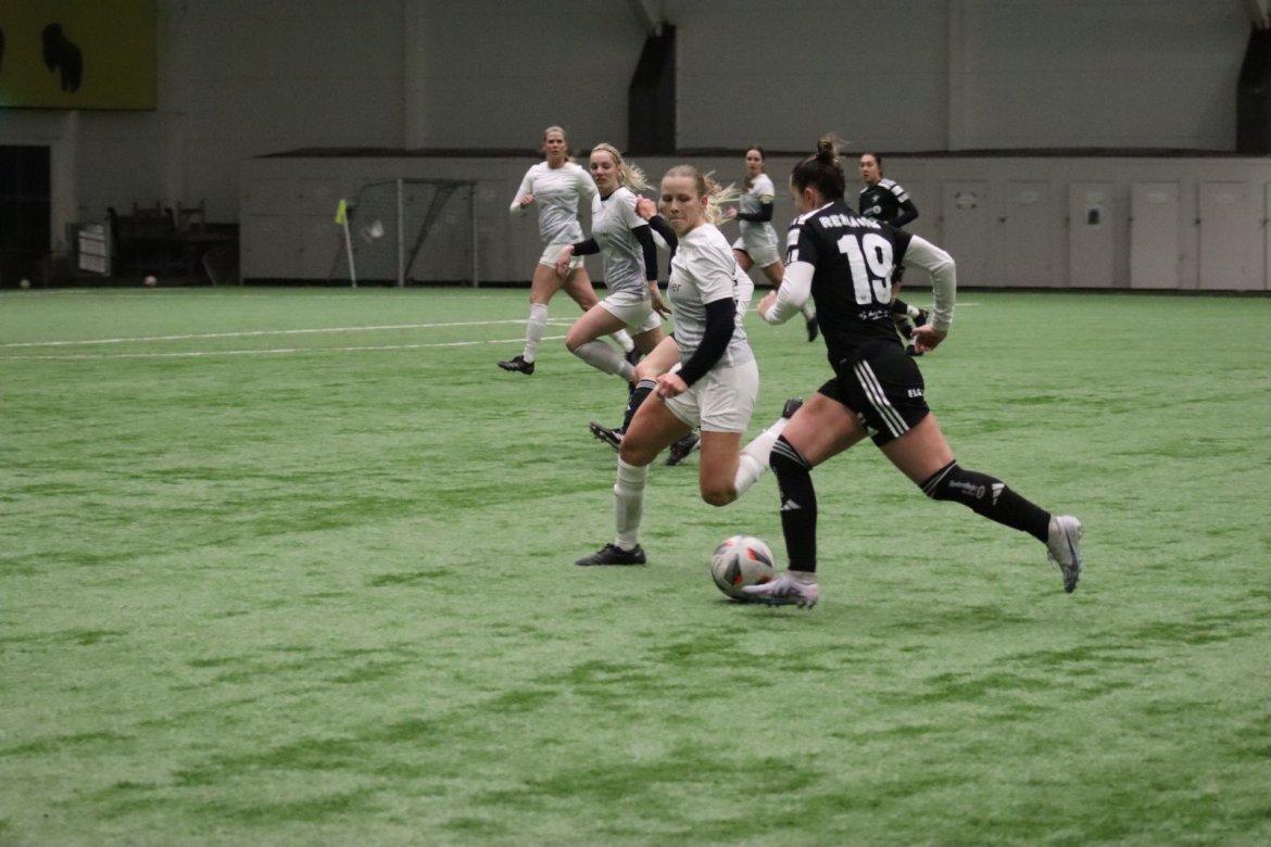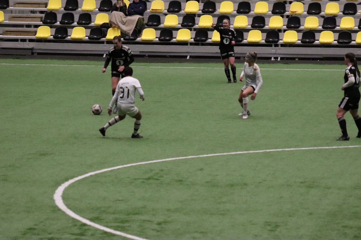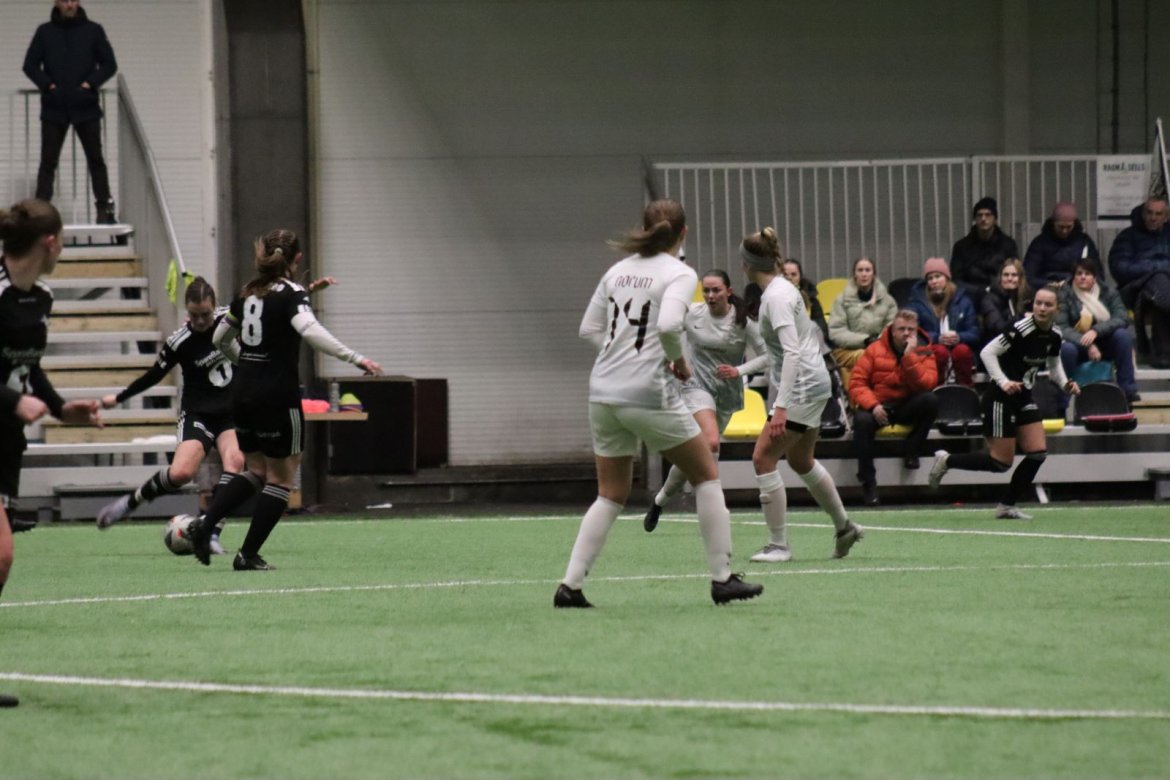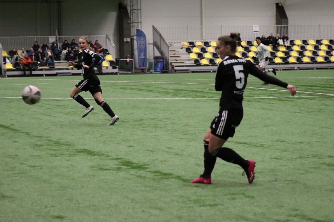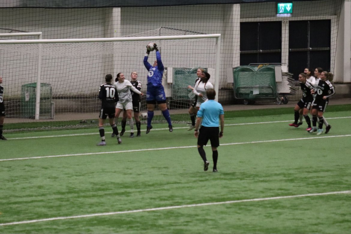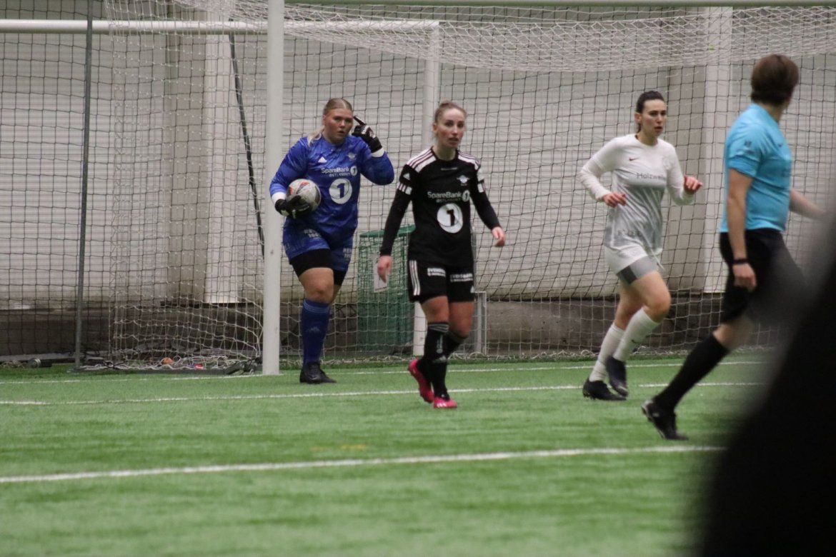 Med alle forutsetninger på plass starter det litt typisk for et lag blandet av ungdommelig pågangsmot og rutinerte gode fotballspillere, nemlig rufsete og hawaiifotball. De første 10 minuttene preges av alle inntrykk vi må ta innover oss, og at det vi har ventet så lenge på endelig er i gang. Det kommer et par skudd imot som havner i stolpen, og målet er heldigvis en god venn denne gangen. Etter hvert kommer vi oss mer inn i kampen og kan takke oss selv for at vi har hatt fokus på forsvarsspill, for det redder oss. Det offensive tar mer tid å få på plass, men vi plukker opp et rom som FC Oslo etterlater seg og klarer på et tidspunkt å utnytte dette. Nora Eriksson vender nydelig opp lavt i banen, og Linnea Rustad er på hugget og starter tidlig på en lang tversover som går over backen til FC Oslo. For første gang i kampen er vi igjennom, Linnea lader kanonen og sender oss opp i 1-0 ledelse med et godt plassert skudd som går over keeper og inn i motsatt hjørne. Vi har tatt ledelsen mot spillets gang, noe som gir laget en enorm selvtillitsboost! Vi er på høyde med FC Oslo ut resten av 1. omgang, og styrer mer av spillet.