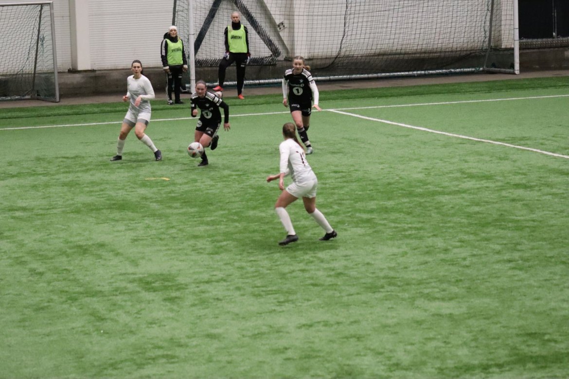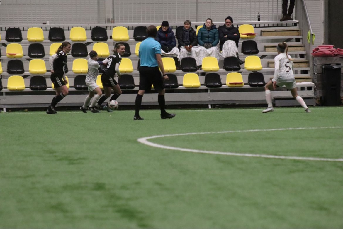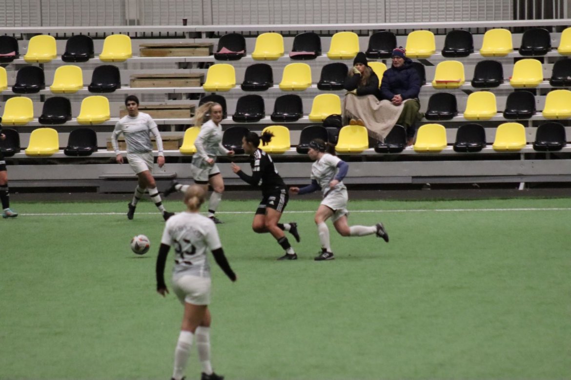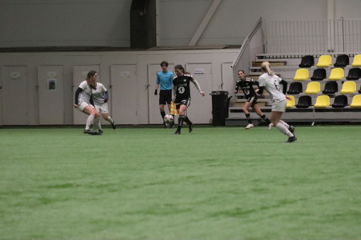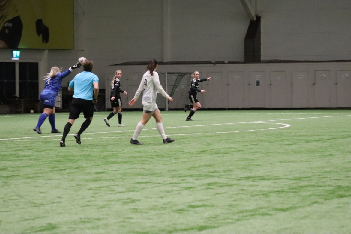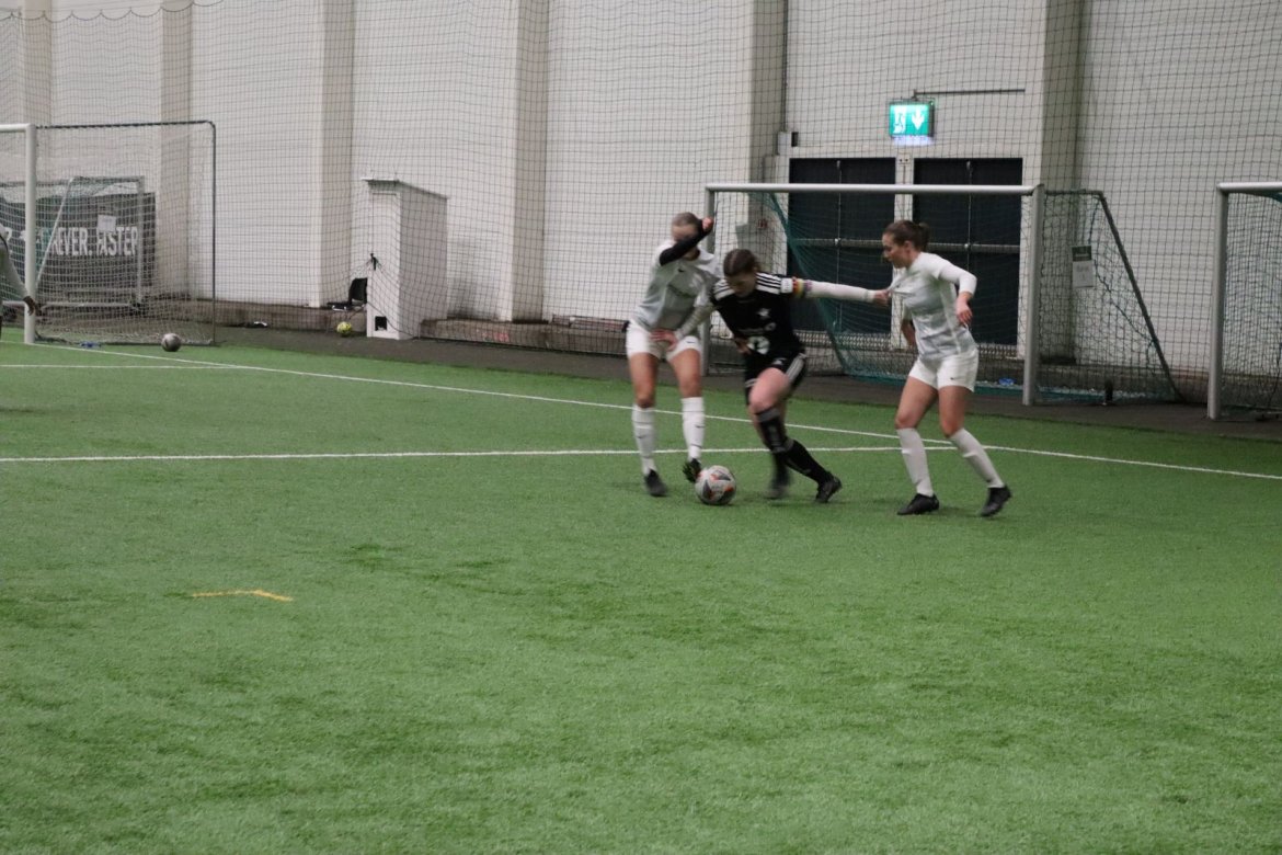 Med alle forutsetninger på plass starter det litt typisk for et lag blandet av ungdommelig pågangsmot og rutinerte gode fotballspillere, nemlig rufsete og hawaiifotball. De første 10 minuttene preges av alle inntrykk vi må ta innover oss, og at det vi har ventet så lenge på endelig er i gang. Det kommer et par skudd imot som havner i stolpen, og målet er heldigvis en god venn denne gangen. Etter hvert kommer vi oss mer inn i kampen og kan takke oss selv for at vi har hatt fokus på forsvarsspill, for det redder oss. Det offensive tar mer tid å få på plass, men vi plukker opp et rom som FC Oslo etterlater seg og klarer på et tidspunkt å utnytte dette. Nora Eriksson vender nydelig opp lavt i banen, og Linnea Rustad er på hugget og starter tidlig på en lang tversover som går over backen til FC Oslo. For første gang i kampen er vi igjennom, Linnea lader kanonen og sender oss opp i 1-0 ledelse med et godt plassert skudd som går over keeper og inn i motsatt hjørne. Vi har tatt ledelsen mot spillets gang, noe som gir laget en enorm selvtillitsboost! Vi er på høyde med FC Oslo ut resten av 1. omgang, og styrer mer av spillet.